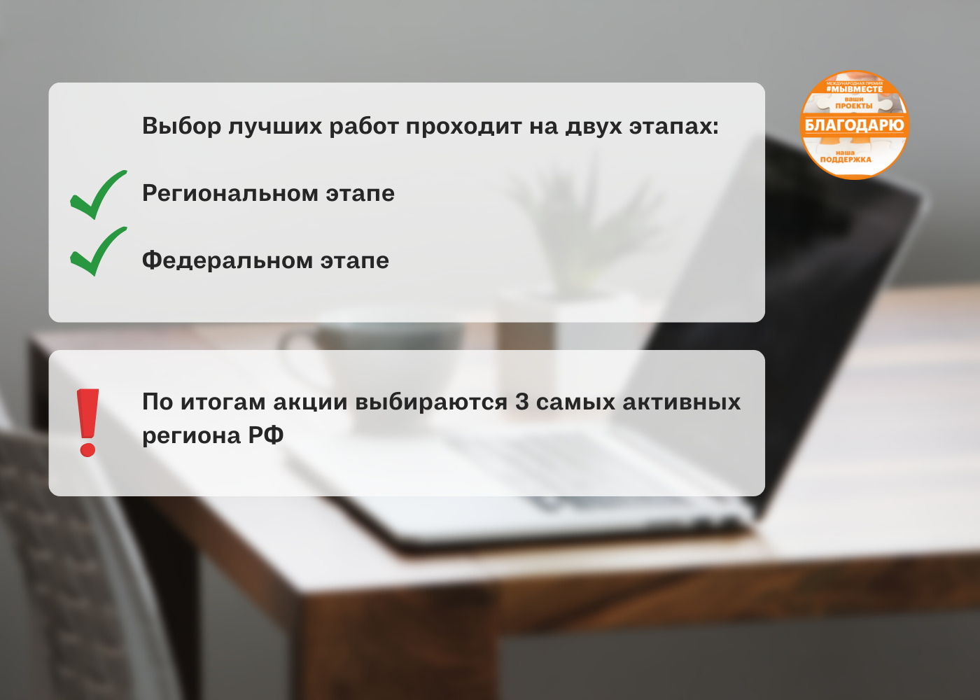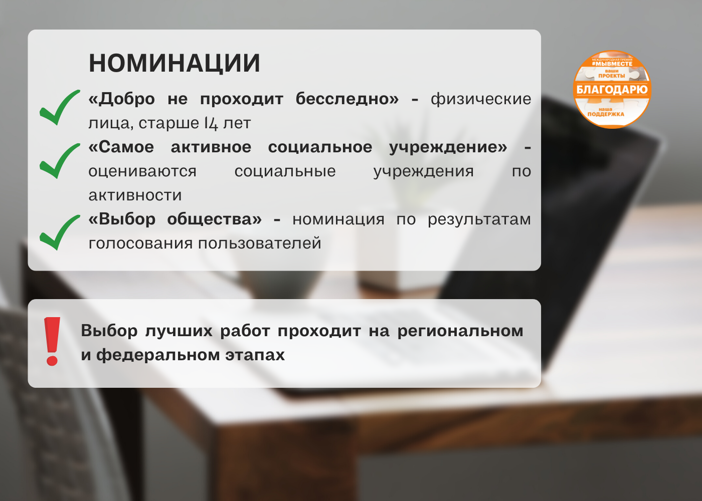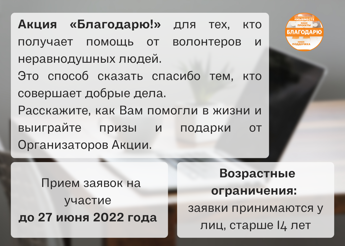 Акция «Благодарю!» для тех, кто получает помощь от волонтеров и неравнодушных людей. Это способ сказать спасибо тем, кто совершает добрые дела. Расскажите, как Вам помогли в жизни и выиграйте призы и подарки от Организаторов Акции.